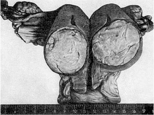 Лейомиома - опухоль из гладких мышц. Пучки гладких мышечных клеток расположены хаотично, строма образована прослойками соединительной ткани, в которой проходят кровеносные и лимфатические сосуды. Если строма развита избыточно, опухоль называют фибромиомой. Лейомиома может достигать больших размеров, особенно в матке