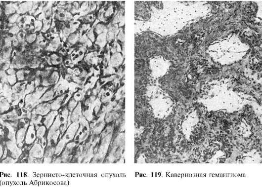 Зернисто-клеточная опухоль (опухоль Абрикосова) обычно небольших размеров, имеет капсулу, локализуется в языке, коже, пищеводе. Состоит из компактно расположенных округлой формы клеток, цитоплазма которых мелкозерниста, жира не содержит (рис. 118). А.И. Абрикосов, впервые описавший эту опухоль (1925), полагал, что она развивается из миобластов (миома из миобластов). Однако в последние годы высказывается мнение о ее гистиоцитарном или нейрогенном происхождении.