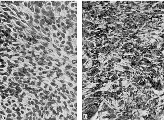 а - дифференцированная (клеточно-волокнистая саркома); б - низкодифференцированная (клеточная саркома)