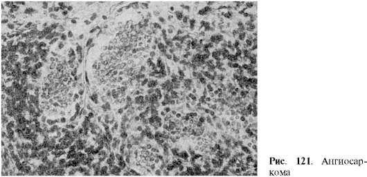 Ангиосаркома - злокачественная опухоль сосудистого происхождения, богатая атипичными клетками либо эндотелиального, либо периоцитарного характера (рис. 121). В первом случае говорят о злокачественной гемангиоэндотелиоме, во втором - о злокачественной гемангиоперицитоме. Опухоль отличается высокой злокачественностью и рано дает метастазы.