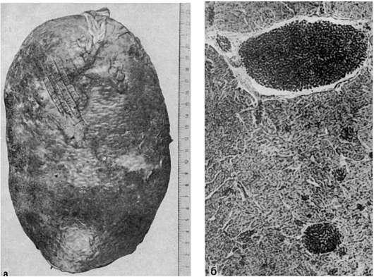 а - увеличение селезенки (масса 2800 г); б - лейкозные стазы и тромбы в сосудах сердца