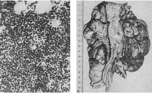 Лимфатические узлы всех областей тела резко увеличены, сливаются в огромные мягкие или плотноватые пакеты (см. рис. 134). На разрезе они сочные, бело-розовые. Увеличиваются размеры миндалин, групповых и солитарных лимфатических фолликулов кишечника, которые также представляют собой сочную бело-розовую ткань. Увеличение лимфатических узлов и лимфатических образований связано с лейкозной их инфильтрацией, которая ведет к резкому нарушению структуры этих органов и тканей; нередко лимфоциты инфильтрируют капсулу лимфатических узлов и окружающие их ткани.