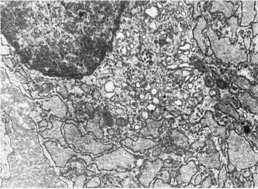 Атрофия гранулярной эндоплазматической сети, т.е. уменьшение ее размеров, светооптически представлена снижением или исчезновением базофилии цитоплазмы, а электронно-микроскопически - уменьшением размеров канальцев и объема сети, количества и размеров рибосом (рис. 13). Она отражает снижение белково-синтетической функции клетки (белковый дефицит при голодании, болезнях печени; старение).