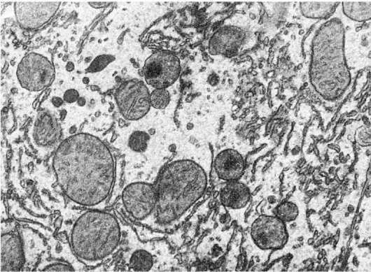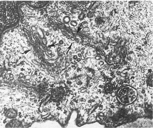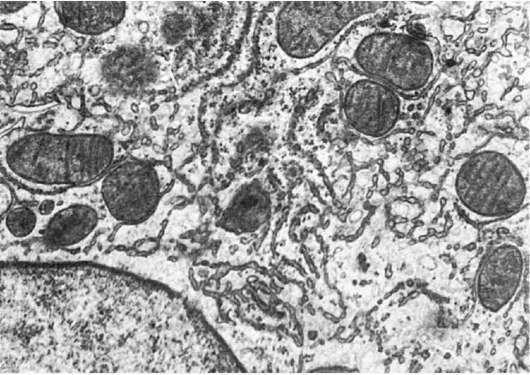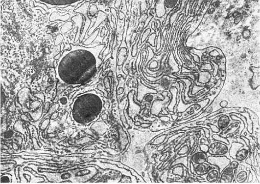 Гиперплазия мембран эндоплазматической сети с расширением ее канальцев и систем (см. рис. 13) может отражать различные по интенсивности и разные по своей сути процессы. Вопервых, это усиление метаболической активности ряда веществ (белков, липидов, лекарственных средств). Во-вторых, это нарушенный внутриклеточный транспорт