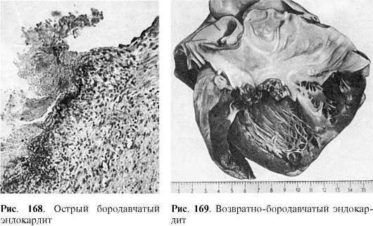 Диффузный эндокардит, или вальвулит (по В.Т. Талалаеву), характеризуется диффузным поражением створок клапанов, но без изменений эндотелия и тромботических наложений. Острый бородавчатый эндокардитсопровождается повреждением эндотелия и образованием по замыкающему краю створок (в местах повреждения эндотелия) тромботических наложений в виде бородавок (рис. 168). Фибропластический эндокардит развивается как следствие двух предыдущих форм эндокардита при особой склонности процесса к фиброзу и рубцеванию. Возвратно-бородавчатый