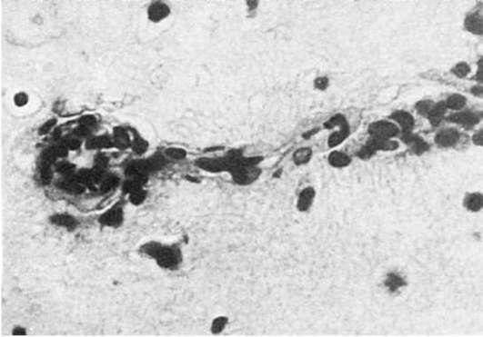 рис. 170) и может выражаться дистрофическими изменениями нервных клеток, очагами деструкции мозговой ткани и кровоизлияниями. Такие изменения могут доминировать в клинической картине, что чаще встречается у детей -церебральная форма ревматизма