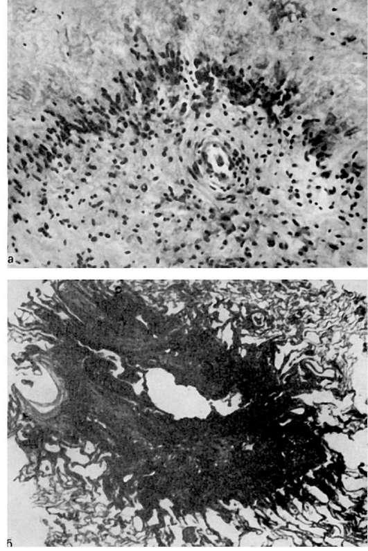 Воколосуставной соединительной ткани первоначально наблюдаются мукоидное набухание, артериолиты и артерииты. Далее наступает фибриноидный некроз, вокруг очагов фибриноидного некроза появляются клеточные реакции: скопления крупных гистиоцитов, макрофагов, гигантских клеток рассасывания. В итоге на месте дезорганизации соединительной ткани развивается зрелая волокнистая соединительная ткань с толстостенными сосудами. При обострении заболевания те же изменения возникают в очагах склероза. Описанные очаги фибриноидного некроза носят название ревматоидных узлов (рис. 171). Они появляются обычно около крупных суставов в виде плотных образований размером до лесного ореха. Весь цикл их развития от начала возникновения мукоидного набухания до образования рубца занимает 3-5 мес.