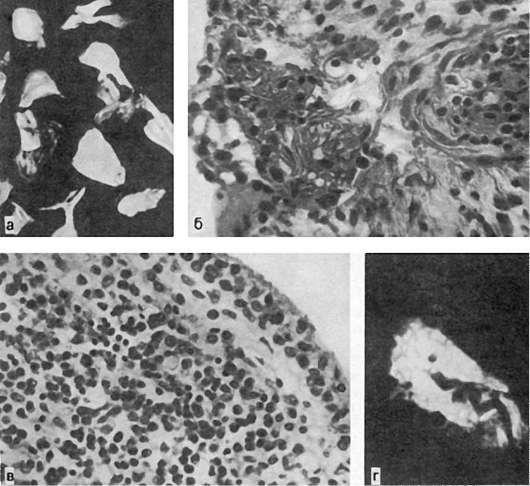 а - рисовые тельца; б - синовит; в - плазматические клетки инфильтрата; г - фиксация IgG в стенке артериолы