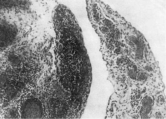 Всиновиальной оболочке воспаление появляется в самые ранние сроки заболевания. Возникает синовит(рис. 172) - важнейшее морфологическое проявление болезни, в развитии которого выделяют три стадии.