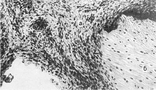 174. Ревматоидный артрит. Грануляционная ткань (а) «наползает» на суставной хрящ (б)