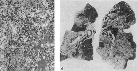 Легочные осложнения развиваются в связи с нарушением фибринолитической функции нейтрофилов. При недостаточности этой функции массы фибрина в альвеолах подвергаются организации, т.е. прорастают грануляционной тканью, которая, созревая, превращается в зрелую волокнистую соединительную ткань. Этот процесс организации называется карнификацией (от лат. сагпо - мясо). Легкое превращается в безвоздушную плотную мясистую ткань. При чрезмерной активности нейтрофилов возможно