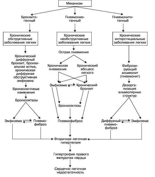различными формами фиброзного (фиброзирующего) альвеолита, или пневмонита. В финале все три механизма ХНЗЛ ведут к развитию пневмосклероза (пневмоцирроза), вторичной легочной гипертензии, гипертрофии правого желудочка сердца и сердечно-легочной недостаточности (см. схему XXI).