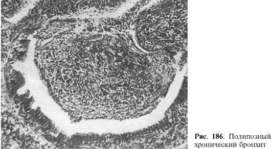 ского эпителия в многослойный плоский, увеличением числа бокаловидных клеток; в других - в стенке бронха и особенно в слизистой оболочке резко выражены клеточная воспалительная инфильтрация и разрастания грануляционной ткани, которая выбухает в просвет бронха в виде полипа - полипозный хронический бронхит (рис. 186). При созревании грануляционной и разрастании в стенке бронха соединительной ткани мышечный слой атрофируется и бронх подвергается деформации - деформирующий хронический бронхит.