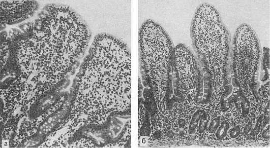 а - хронический энтерит без атрофии; неравномерная толщина ворсинок, булавовидное утолщение их дистальных отделов, дистрофия энтероцитов, полиморфно-клеточная инфильтрация стромы; б - хронический атрофический энтерит; укорочение ворсинок, их деформация и срастание; выраженная лимфогистиоцитарная инфильтрация стромы