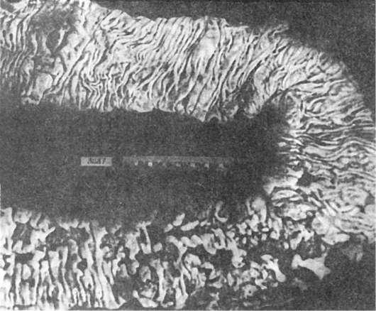 Патологическая анатомия. Наиболее часто изменения находят в терминальном отрезке подвздошной кишки, в прямой кишке (особенно в анальной части) и аппендиксе; другие локализации редки. Поражается вся толща кишечной стенки, которая становится резко утолщенной и отечной. Слизистая оболочка бугристая, напоминает «булыжную мостовую» (рис. 209), что связано с чередованием длинных, узких и глубоких язв, которые располагаются параллельными рядами по длиннику кишки, с участками нормальной слизистой оболочки. Встречаются также глубокие щелевидные язвы, расположенные не по длиннику, а по поперечнику кишки. Серозная оболочка нередко покрыта спайками и множественными белесоватыми узелками, которые похожи на туберкулезные. Просвет кишки сужен, в толще стенки образуются свищевые ходы. Брыжейка утолщена, склерозирована. Регионарные лимфатические узлы гиперплазированы, бело-розового цвета на разрезе.
