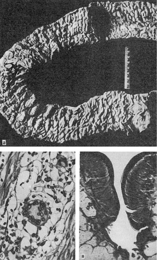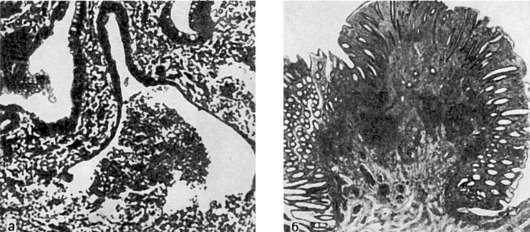 Наиболее характерным микроскопическим признаком является неспецифический гранулематоз, который охватывает все слои кишечной стенки. Гранулемы имеют саркоидоподобное строение и состоят из эпителиоидных и гигантских клеток типа ПироговаЛангханса (см. рис. 209). Считаются характерными также отек и диффузная инфильтрация лимфоцитами, гистиоцитами, плазматическими клетками подслизистого слоя,