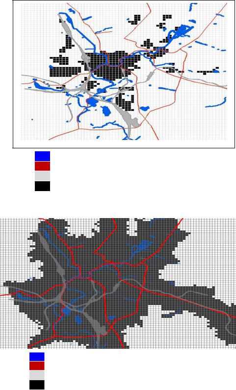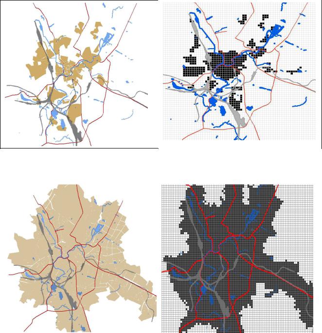 Рис. 3.12 – Сравнение результатов моделирования динамики городской застройки и картографических данных в различные моменты времени: а) застройка города на начало XX века и (б) ее представление в модели; в, г) 2004 год и модель, полученная на 353 итерации