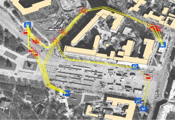 На рис. 3.15 показан фрагмент городского геоинформационного пространства (транспортный узел), который представлен в модели движения пешеходов в виде базы геоданных. Транспортный узел содержит остановки метро, основные остановки маршрутных автобусов и электротранспорта, соединенные между собой основными направлениями движения пешеходов-агентов.