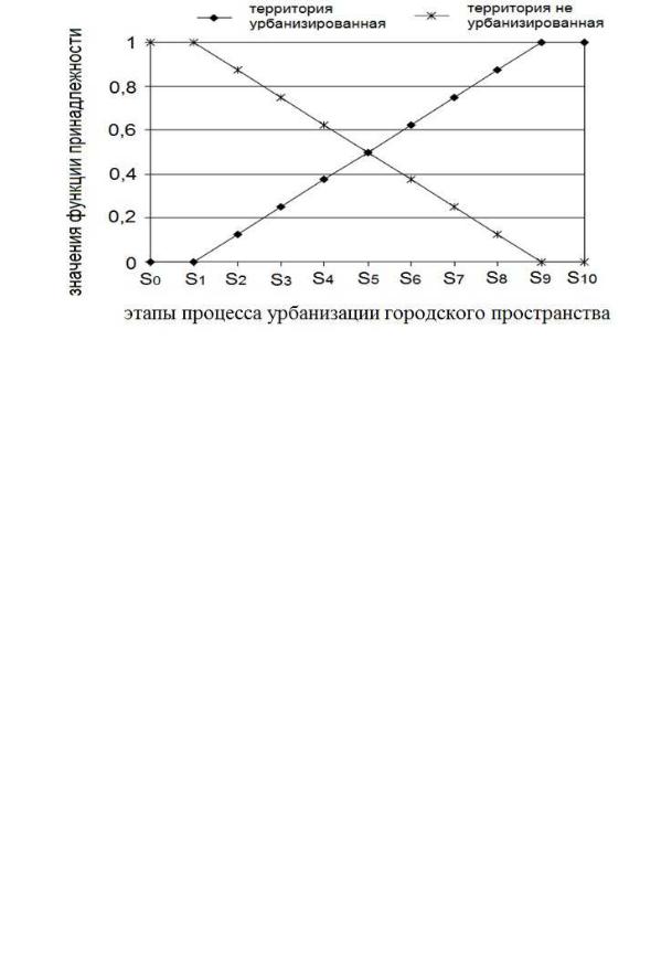 как урбанизированной территории так и не урбанизированной, причем каждая единичная ячейка ОС-пространства получает тем большее значение функции принадлежности, чем большей степени территория соответствует урбанизированному или не урбанизированному состоянию и единичная ячейка ОС-пространства принимает тем меньшее значение, чем в большей