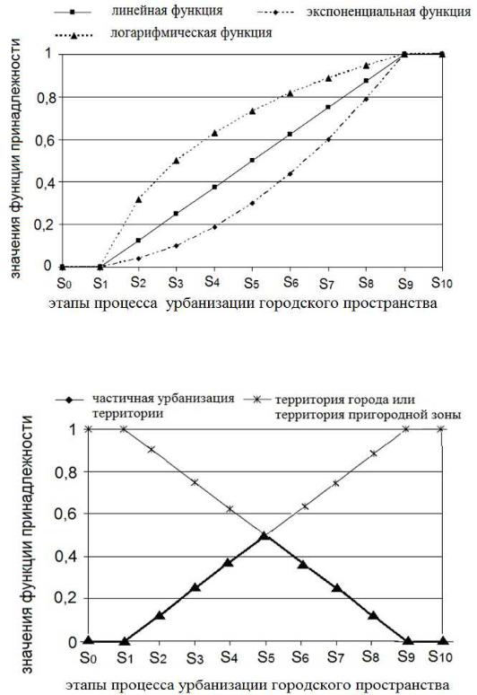 Рис. 4.4 – Различные виды функций принадлежности и их влияние на степень и интенсивность процесса урбанизации городского пространства