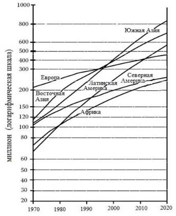 Рис. 4.11 – Логистическая кривая развития градостроительных систем с 1950 по 2000 года. По оси y – население в миллионах, x – ось времени.