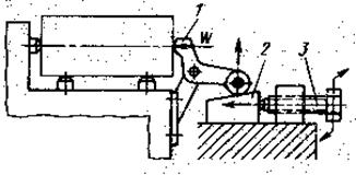 Второй вариант. Сила зажима W и сила резания Р действуют на обрабатываемую деталь 1 в противоположных направлениях; требуемая сила зажима W=KP.