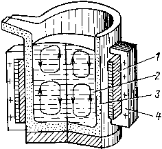 Индукционная тигельная печь (рис. 3.1) состоит из следующих основных элементов: индуктора 1, подключаемого к источнику переменного тока; нагреваемого металла 2; огнеупорного тигля 3 для размещения расплавляемого металла; внешнего магнитопровода 4, применяемого в некоторых печах средней частоты и в печах большой емкости промышленной частоты для экранировки кожуха печи (для уменьшения потерь энергии); устройства для слива металла; токоподводов.
