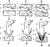 В промежуток между медным инструментом (катодом) и заготовкой изделий (анодом) подается под давлением электролит. Если инструмент фасонный, то, так как плотность тока наибольшая у выступов инструмента, там, где межэлектродный зазор минимальный (линейная скорость растворения пропорциональна зазору), будет сосредоточена наибольшая скорость растворения анода. В результате против выступов инструмента образуются на изделии впадины, и в конечном счете изделие принимает форму оттиска с инструмента (рис. 4.1, а). По этому же принципу может быть осуществлено воспроизведение профиля катода в аноде (рис. 4. 1,6) и прошивание в последнем отверстий. При движении электролита в межэлектродном пространстве можно не только удалять образующиеся гидроокиси, но и выполнять обработку при повышенных плотностях тока (до сотен А/см2), если обеспечить интенсивное охлаждение электролита, нагреваемого большими токами.