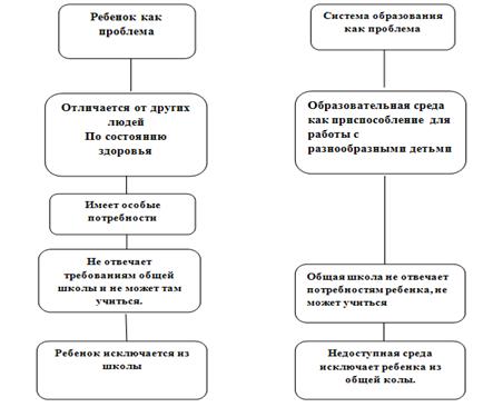 Как видно из рисунка медицинский подход несет основное понятие - ребенок, как проблема, в социальном подходе - система образования, как проблема. Основными социальными проблемами детей с ограниченными возможностями являются барьеры в осуществлении прав на охрану здоровья и социальную адаптацию, образование.