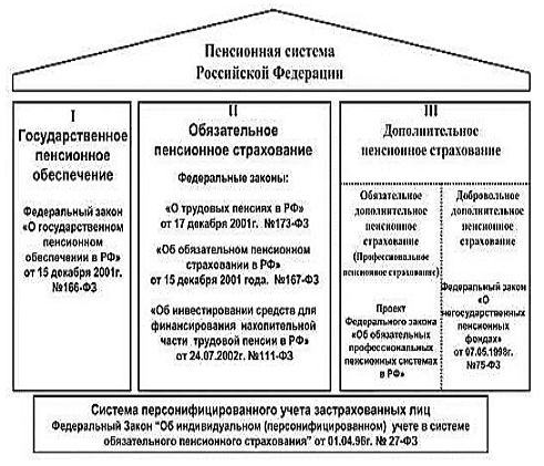 Этими законами были заложены краеугольные камни действующей пенсионной системы. Закон о трудовых пенсиях определил основания возникновения и порядок реализации права граждан на трудовые пенсии. Закон о государственном пенсионном обеспечении урегулировал правоотношения, возникающие при предоставлении пенсий по государственному пенсионному обеспечению. Закон об обязательном пенсионном страховании установил организационные, правовые и финансовые основы пенсионного страхования в России. Помимо вышеперечисленных в систему пенсионного законодательства входят также следующие законодательные акты: