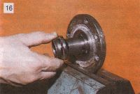 Съемником запрессовываем ступицу в подшипник. Теперь шайбы съемника упираются во внутреннее кольцо подшипника и ступицу. Дальнейшую сборку производим в обратной последовательности, затягиваем гайку подшипника предписанным моментом и обязательно стопорим замятием буртика.