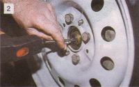 Головкой "на 30" ослабляем гайку подшипника ступицы. Гайка затянута большим моментом, поэтому головка и вороток должны быть достаточно прочными, чтобы передать необходимое усилие. Ослабляем болты крепления колеса. Вывешиваем переднюю часть автомобиля (именно оба передних колеса, т. к. в противном случае стабилизатор поперечной устойчивости мешает демонтажу, поджимая элементы подвески вверх). Снимаем колесо, направляющую тормозных колодок вместе с суппортом и тормозной диск суппортом подвязываем так, чтобы они не висели на тормозном шланге.