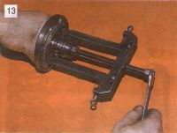 Съемником запрессовываем новый подшипник в поворотный кулак. При этом большая шайба съемника опирается изнутри на поворотный кулак так, чтобы не повредить его грязезащитные кольца, а на новый подшипник при запрессовке можно нажимать через старый подшипник, который будет передавать усилие только через наружное кольцо. Устанавливаем стопорное кольцо.