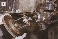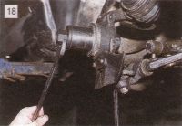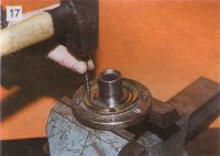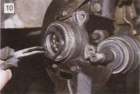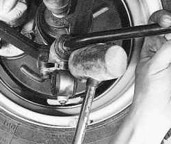 Проворачивая ступицу, через выколотку из мягкого металла выбиваем ее из поворотного кулака.