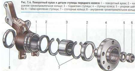 Прежде всего, хотелось довести конструкцию поворотного кулака, подшипника в нем, и колец установленных на автомобиле Лада Гранта. Наглядно конструкция с описанием элементов в ней показана на рисунке ниже.