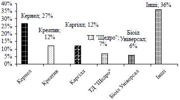 Для конкретних розрахунків обрані підприємства харчової промисловості. На рис. 2 представлені провідні виробники соняшникової олії в Україні. Якщо розглядати лідерів ринку з виробництва нерафінованої соняшникової олії, то найбільша частка належить компаніям ізвертикально інтегрованою структурою виробництва, яким притаманний повний цикл виробництва - від вирощування, зберігання та переробки сировини до виробництва та реалізації готової продукції, що дозволяє отримати економію витрат та раціонально управляти фінансовими, ресурсними та інформаційними потоками [3, с. 148]. Ці компанії забезпечують собі значні конкурентні переваги за рахунок власної системи елеваторів, сільськогосподарських підприємств, торгових домів, а також співпраці з іноземними партнерами.