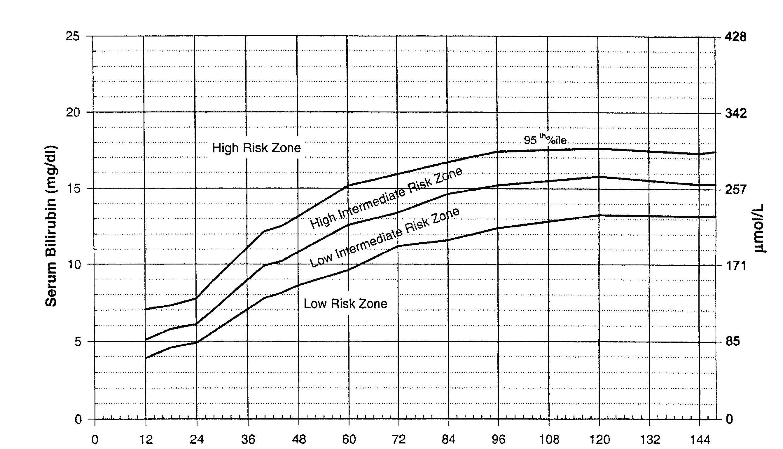 Рис. 2. Номограмма оценки риска для 2840 здоровых новорождённых со сроком гестации 36 и более недель и массой при рождении 2000 г. и более, или со сроком гестации 36 и более недель и массой 2500 г. и более. Номограмма основана на определении уровня билирубина сыворотки в определённые часы жизни детей. Уровень билирубина сыворотки определялся перед выпиской. В зависимости от того, в какую зону попадает полученный уровень билирубина, можно предположить повышение его уровня в динамике более 95 перентиля (зона высокого риска), как показано в ПРИЛОЖЕНИИ 1, табл. 4. См. в ПРИЛОЖЕНИИ 1 дополнительную информацию об этой номограмме, которая не должна быть использована для истинного отражения неонатальной гипербилирубинемии.