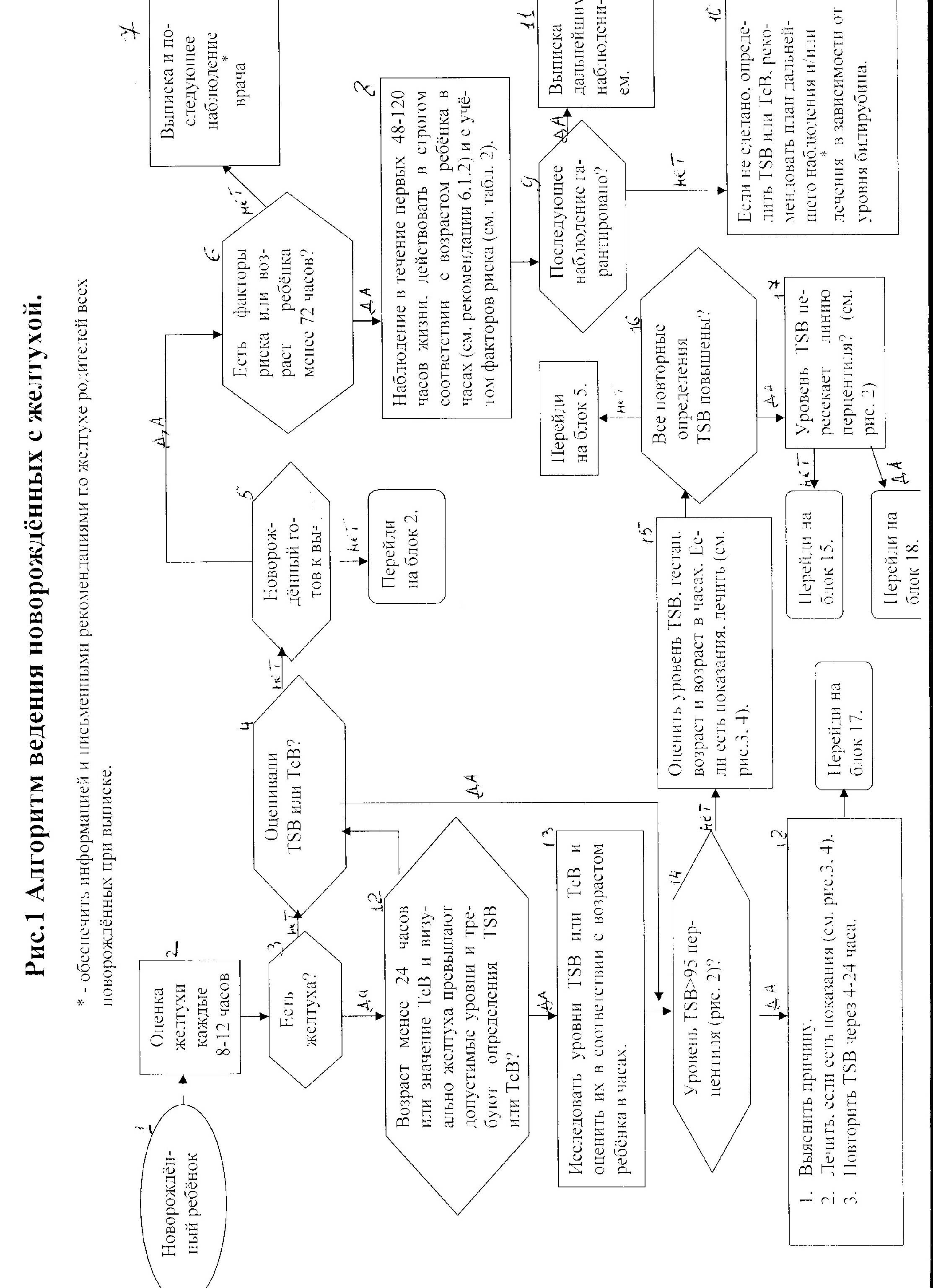 РЕКОМЕНДАЦИЯ 3.0: Необходимо измерить уровни TcB и/или TSB у каждого младенца, пожелтевшего в первые 24 часа жизни (рис.1 и табл. 1) (уровень доказательства – С, польза превышает вред). Необходимость и время повторного определения TcB и TSB будет зависеть от того, в какую зону попадает уровень TSB (рис. 2), возраста ребёнка и динамики гипербилирубинемии. Рекомендации по оценке TSB у ребёнка в возрасте более суток представлены на рисунке 1 и в таблице 1.