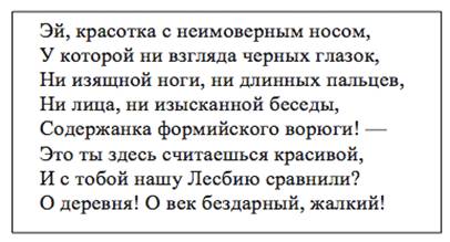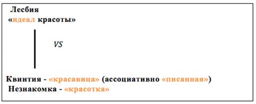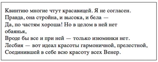 Для прилагательного "formosa" (LXXXVI) Торпусман предлагает все тот же русскоязычный аналог "красивая", правда, несколько видоизменяя его посредством синонимичных категориальных преобразований. Несмотря на одинаковую конструкцию "formosa est", повторяющуюся в начале и конце стихотворения, переводчица в обоих случаях применяет разные формулы, чередуя существительное "красавица" и словосочетание "идеал красоты" и, тем самым, противопоставляя Квинтию и Лесбию. Оппозиция происходит через две, с первого взгляда похожие, но разные по значению, толкованию и ассоциативному ряду единицы языка: "красавица", например, во многих контекстах соединяется с определением "писанная", обретая ироническую окрашенность и несколько теряя свое прямое значение восхищения женской наружностью. Другой эффект достигается с помощью сопряжения "красоты" с понятием идеала, возносящего описываемый объект в сферу "трудно достижимой степени совершенства". Таким образом, вырисовывается вертикальная и антонимичная параллель, созданная не столько самой лексемой "красивая", сколько ее производными определениями.