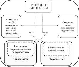Виклад основного матеріалу дослідження. Туристичний ринок в Україні характеризується великою нестабільністю. Це зумовлено негативним впливом політичних, економічних, екологічних, соціальних та інших факторів. Одним із напрямів покращення даної ситуації є створення великих туристичних підприємств чи об’єднань, для забезпечення ефективної економічної діяльності та контролю на ринках.