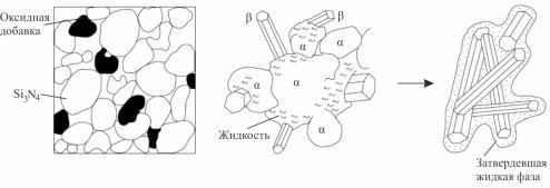 Механизм спекания состоит из следующих процессов: уплотнение частиц по твердофазному механизму спекания; образование легкоплавких силикатов и стекол; перераспределение частиц Si3N4 в присутствии жидкой силикатной фазы; растворение α- и β-Si3N4 в силикатном расплаве на межфазной границе и перекристаллизация его в виде β-Si3N4