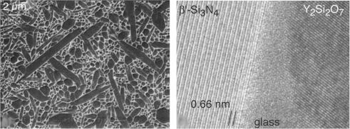 Рис. 3.5. Микроструктура керамического материала на основе Si3N4 с добавлением Al2O3 и Y2O3 (а) и вторичная кристаллическая фаза, отделена от зерна β-Si3N4 остаточной стеклофазой (б)
