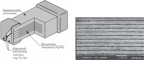 Рис. 4.3. Структура многослойного керамического конденсатора (а) и изображение внутреннего среза конденсатора производства фирмы Murata (б)