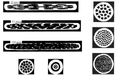 Рис. 4.13. Поперечные сечения ленточных проводов из ВТСП-материалов. Поперечныесечения лент0,2–0,25×3,0–3,5 м2; диаметры круглых проводников 0,8–1,0 мм; критическая плотность тока до 3×104 А · см–2; критическая температура до 100 К