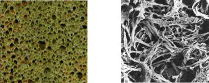 Рис. 4.18. Образцы материалов с открытой и закрытой пористостью: а – закрытая пористость (пеностекло); б – (открытая пористость) волокнистопористый материал из фторопласта Грифтекс (размер пор 10…15 мкм, пористость 80…90 %)