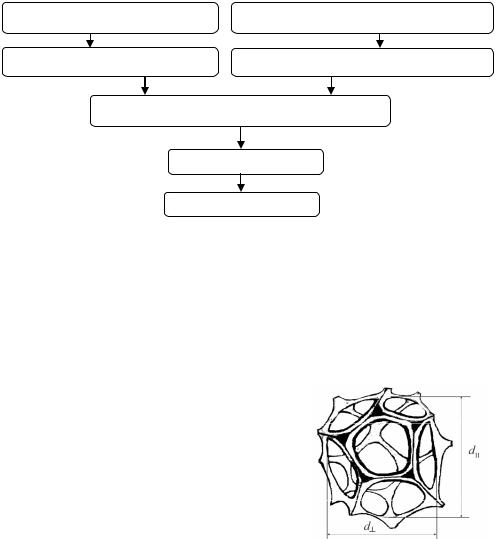 Одной из важнейших характеристик ВПЯМ является средний диаметр ячеек (d), отличающийся от диаметра ячеек в направлении, перпендикулярном к направлению вспенивания (d ), и диаметра ячеек в направлении вспенивания (dII) (рис. 4.22). Связь между этими характеристиками находится из соотношения