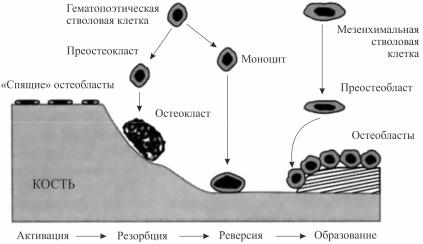 Процесс перестройки костной ткани получил название ремоделирования или «костного оборота» (рис. 4.32). Процесс ремоделирования состоит из трех фаз: резорбции, реверсии и формирования. Соотношение между резорбцией и формированием новой ткани регулируется ионами кальция, метаболитами витамина D, гормонами, инсулином, простогландинами и т.д. Биологический смысл этого феномена состоит в приспособлении механических свойств кости к постоянно меняющимся условиям окружающей среды.