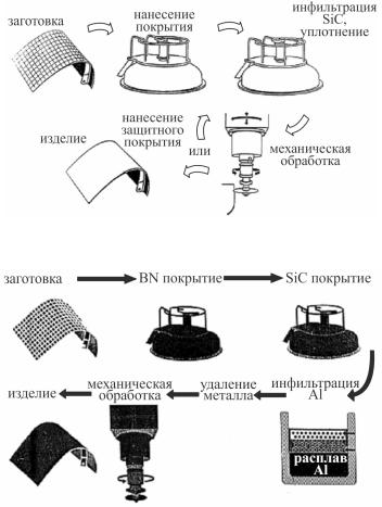Перспективным процессом изготовления композитов, армированных непрерывными волокнами, является также пропитка волокнистых каркасов жидкой фазой с использованием золь-гель процессов или пиролиза металлоорганических полимеров, таких как поликарбосиланы, для формирования карбидкремниевых матриц. Недостатком данных процессов является высокая усадка матрицы и необходимость многократного проведения операций пропитки и последующей термической обработки.