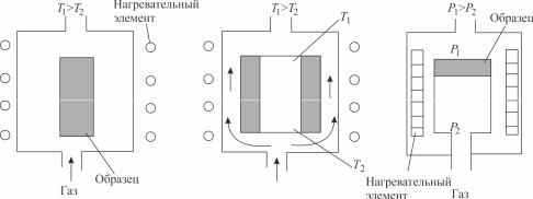 Имеются три основных метода осаждения углерода из газовой фазы: изотермический метод, метод температурного градиента и метод градиента давления (рис. 5.25).