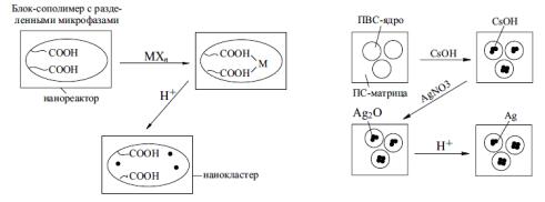 Такой метод оказался эффективным при использовании двойного блок-сополимера – из стирола и 2-винилпиридина. В этом случае прозрачные пленки сополимера отливают из раствора, содержащего соли серебра, меди, кобальта или кадмия с последующим их восстановлением до чистого металла или его сульфидов. В результате образуются ламеллярные, колончатые и сферические структуры с регулируемым размером нанокластера.